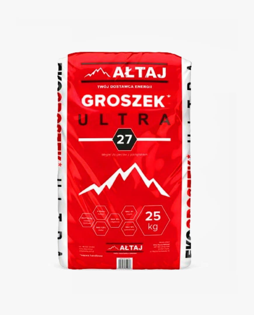 Groszek Ultra produkowany przez firmę Ałtaj to ekonomiczny, mocny, workowany węgiel o bardzo wysokiej kaloryczności i niskim popiele. Firma gwarancje braku spieku oraz znikomą zawartość siarki. Groszek przed spakowaniem przechowywany jest pod zadaszeniem, co daje 100 % pewność, że towar jest suchy. Produkt został przesiany z nadmiaru miału węglowego oraz podany procesowi odkamienienia. Polecany do kotłów z podajnikiem ślimakowym, tłokowym oraz kuchni węglowych.